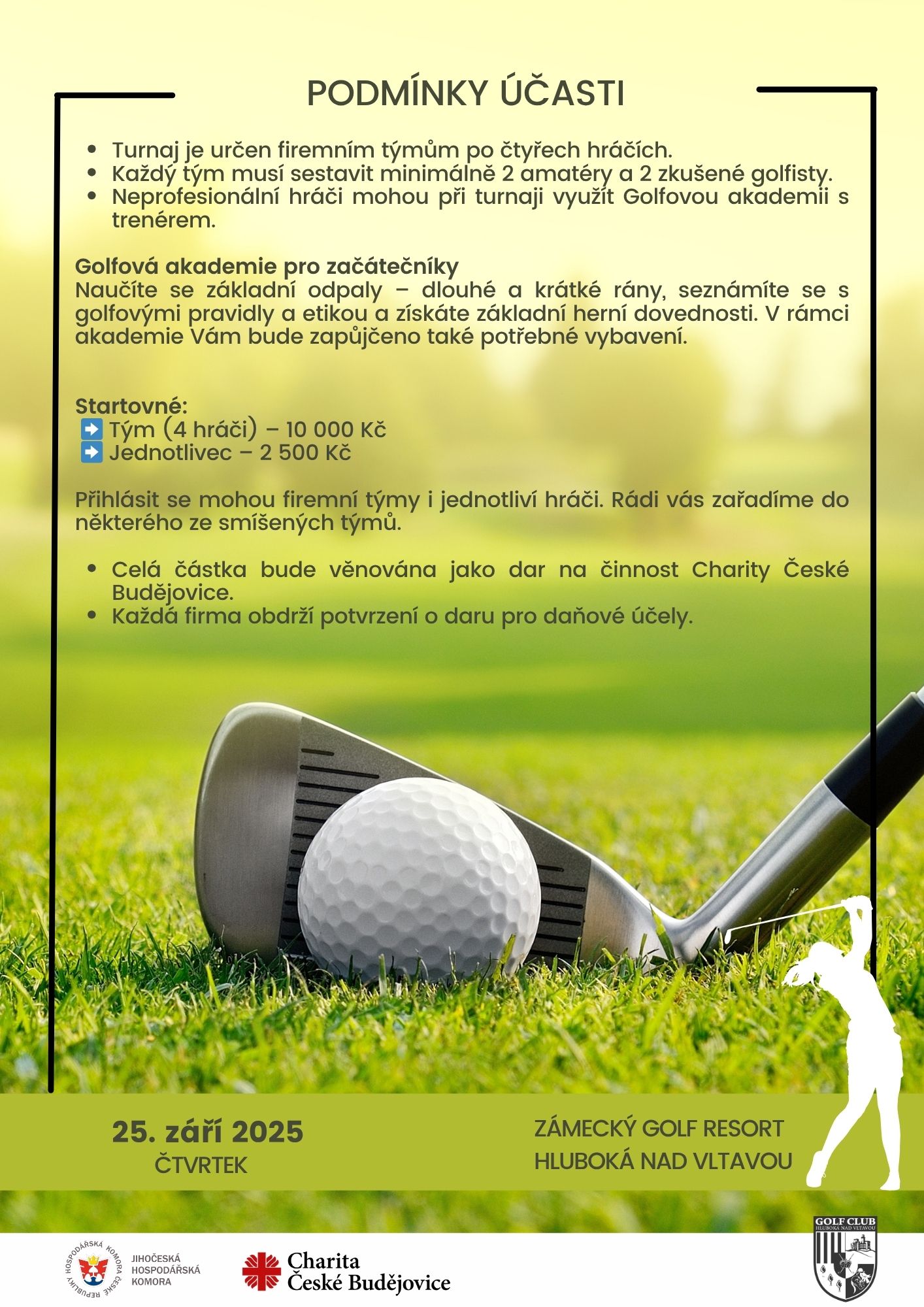 Ve čtvrtek 25. září 2025 se na Zámeckém Golf Resortu Hluboká nad Vltavou uskuteční Charitativní golfový turnaj na podporu Charity České Budějovice. Akci pořádá Jihočeská hospodářská komora ve spolupráci s Charitou České Budějovice. Čeká vás den plný sportu, byznysového networkingu a skvělé atmosféry.
