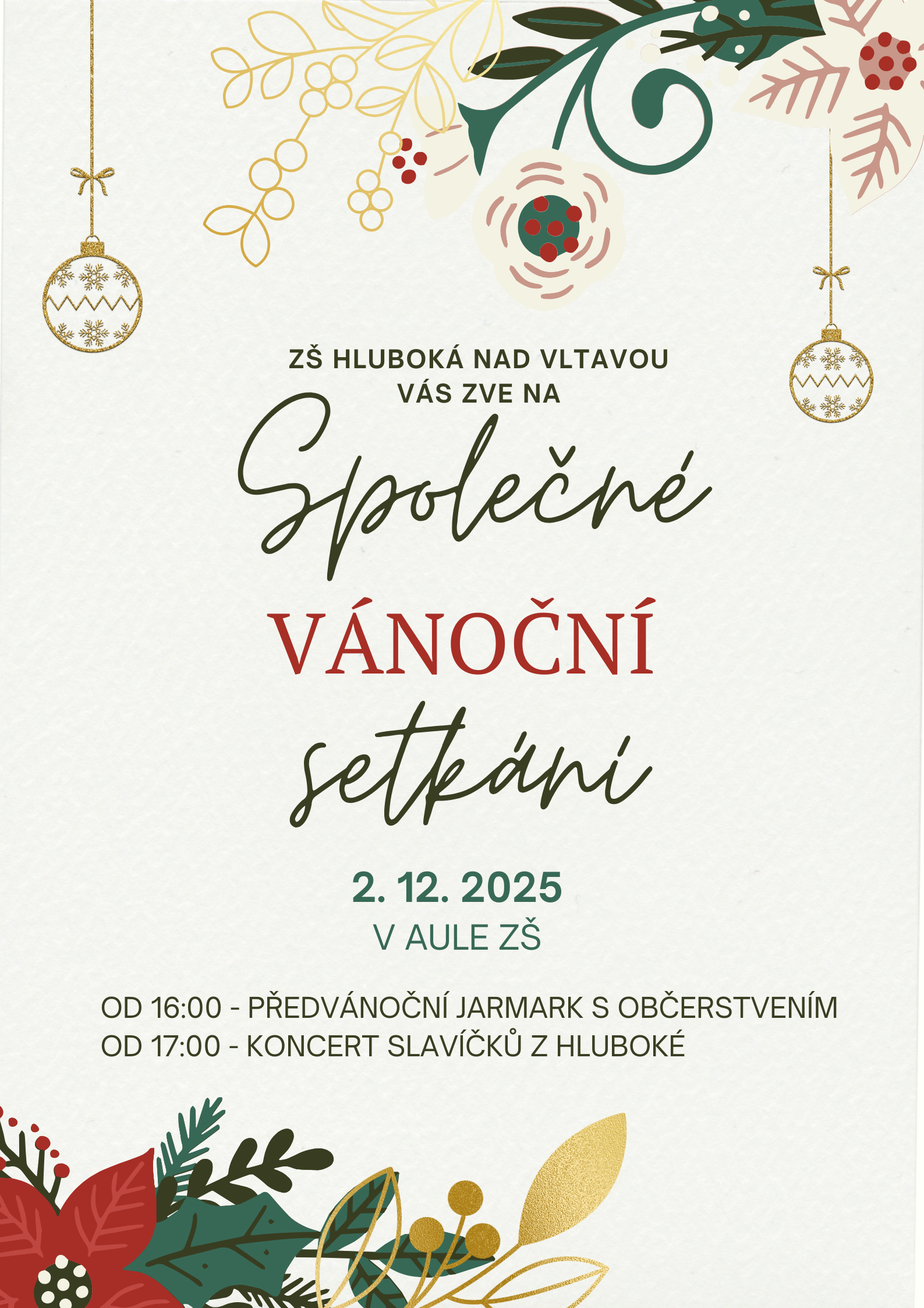 Základní škola Hluboká nad Vltavou vás zve v úterý 2. 12. 2025 na Společné vánoční setkání do auly školy.
