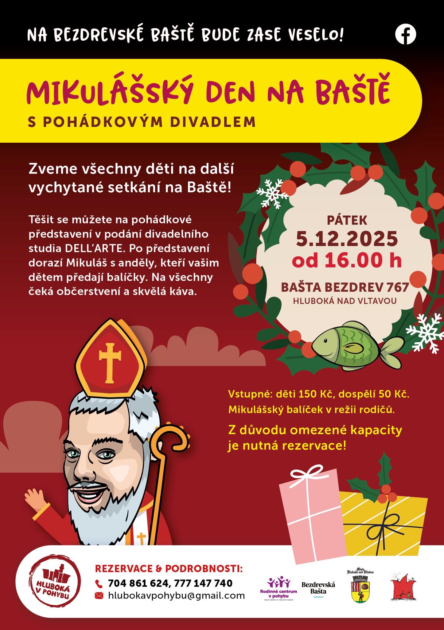zveme všechny děti i rodiče na kouzelné odpoledne s pohádkovým divadlem, Mikulášem a anděly na Bezdrevskou Baštu v pátek 5. 12. 2025 od 16 hodin.