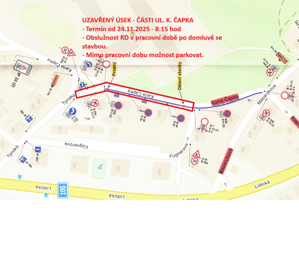 Uzavírka ul. K.Čapka u ZŠ bude od 24.11.2025 do 5.12.2025, vždy od 8,15,hod. - viz příloha.