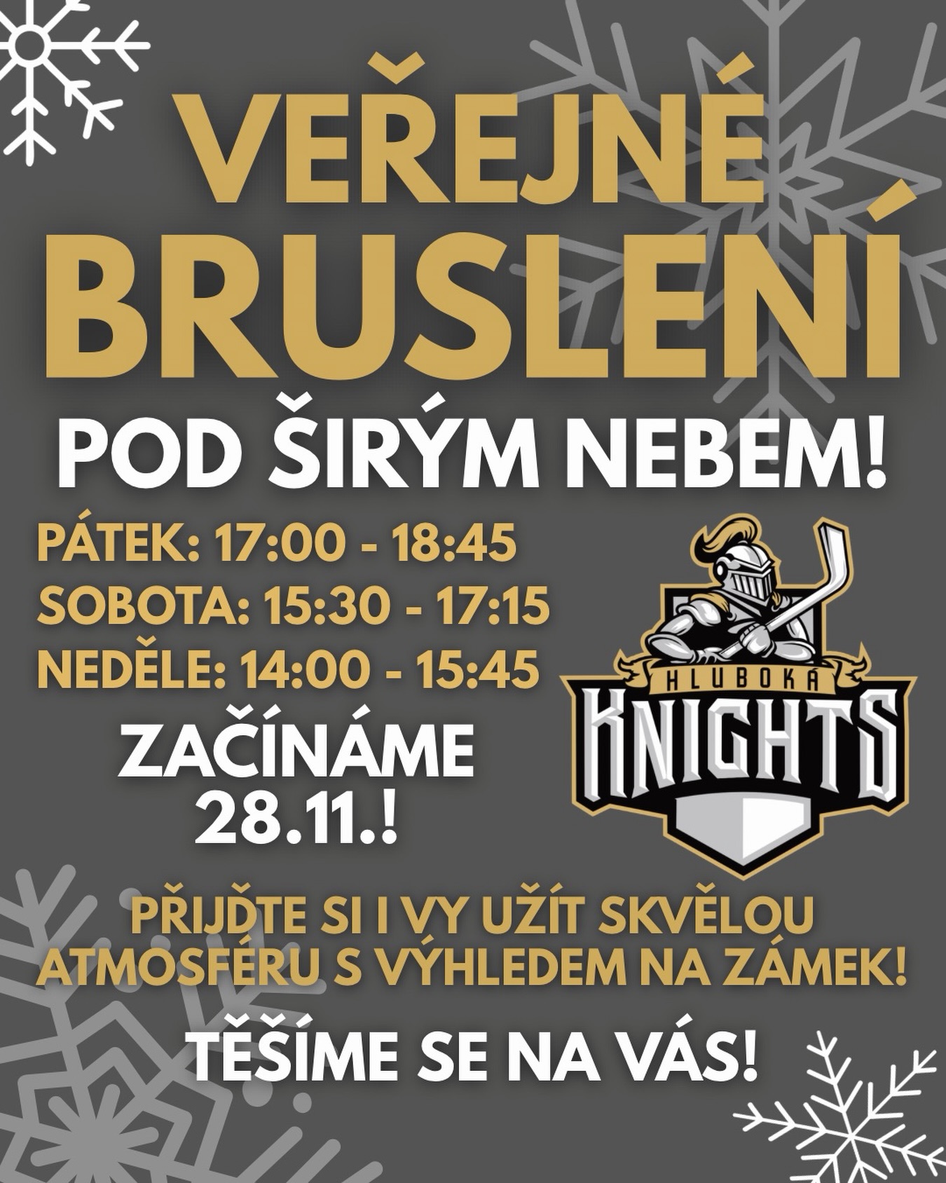 zimní stadion v Hluboké nad Vltavou zahájí v 𝐩𝐚́𝐭𝐞𝐤 𝟐𝟖. 𝟏𝟏. 𝟐𝟎𝟐𝟓 𝐩𝐨𝐬𝐥𝐞𝐝𝐧𝐢́ 𝐬𝐞𝐳𝐨́𝐧𝐮 𝐩𝐨𝐝 𝐬̌𝐢𝐫𝐲́𝐦 𝐧𝐞𝐛𝐞𝐦.