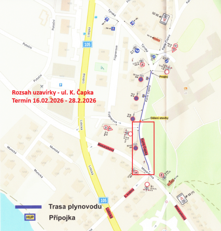 podle sdělení firmy CB plyn s.r.o. budou práce na další etapě rekonstrukce plynovodu v ulici Karla Čapka zahájeny v pondělí 23.2.2026 po 8:00 hod. a budou trvat cca 14 dní.